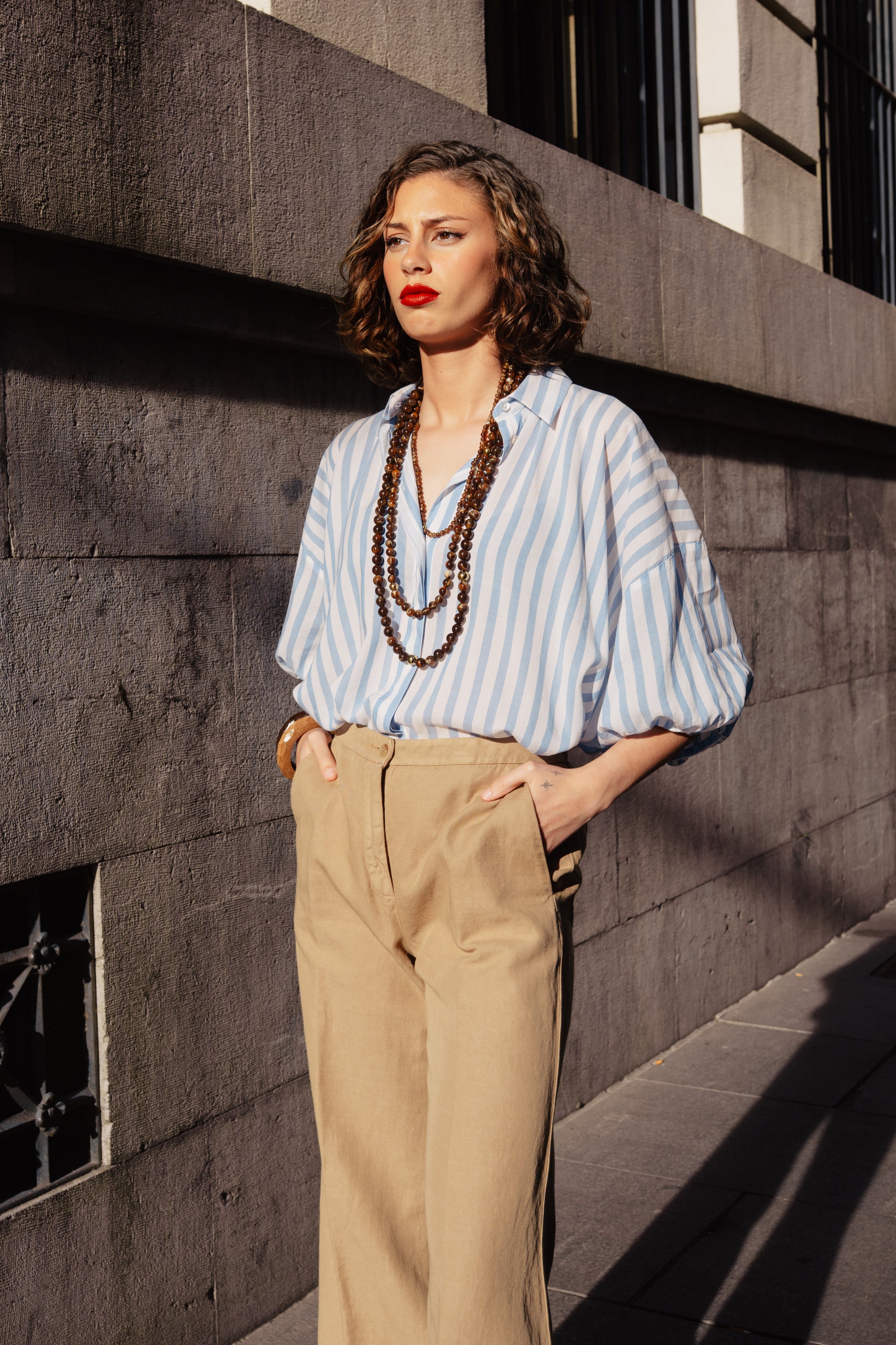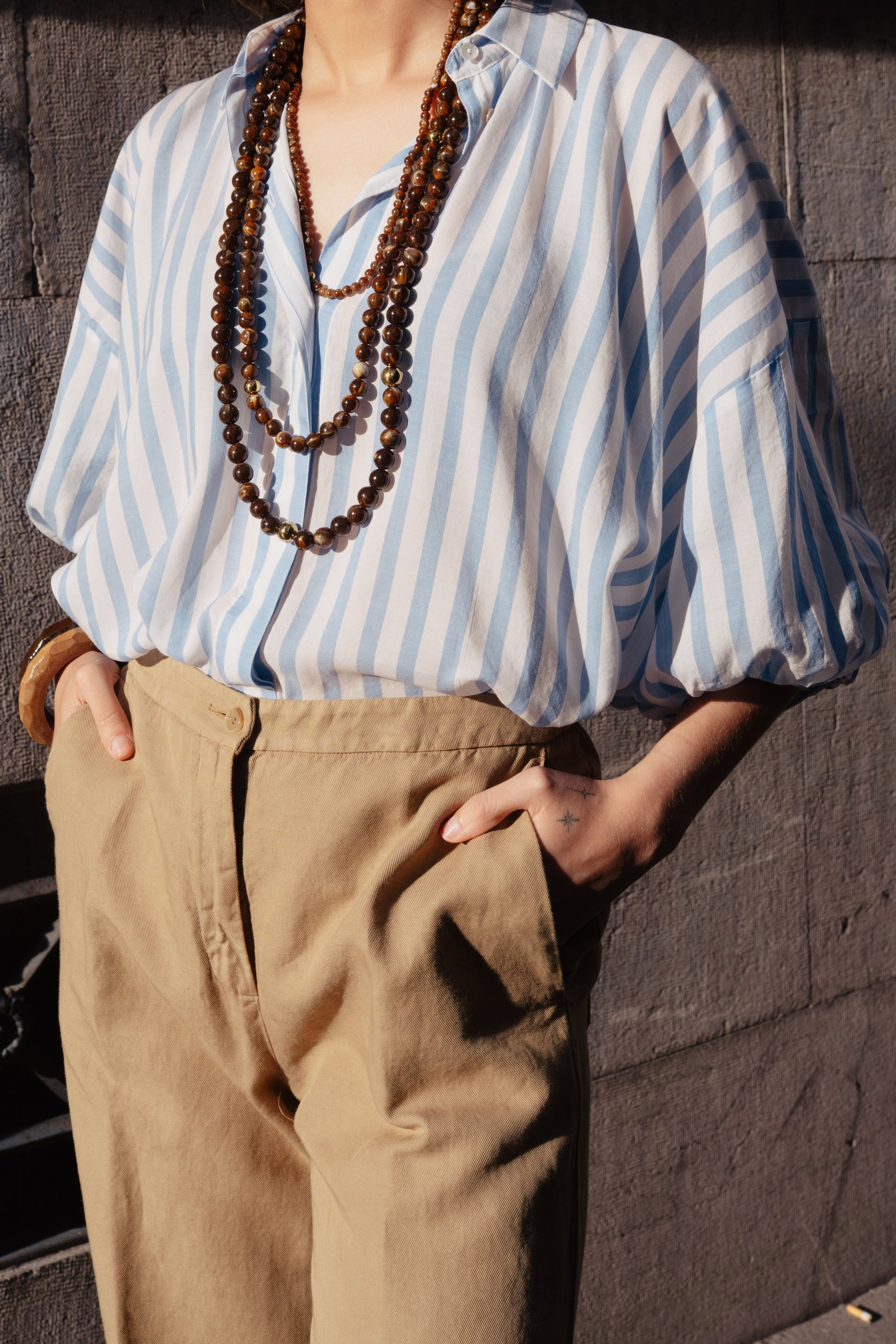 Blusa de rayas , cuello camisero y manga abullonada , corte amplio
